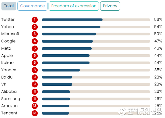 트위터(56점)와 야후(54점), 마이크로소프트(50점), 구글(47점), 메타(46점) 등 미국 빅테크가 1∼5위를 차지했다. 애플과 카카오 다음이 러시아 얀덱스(35점)였고, 중국 바이두(百度)(28점), 러시아 VK(28점)가 공동 9위였다.