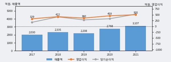 최근 실적을 살펴보면 2021년 매출액이 최근 5년 중 가장 높은 실적을 기록했음을 알 수 있다. 이전 최고 실적이었던 2020년 보다도 12.3%(339억 7천만원) 늘어난 것으로 나타났다.