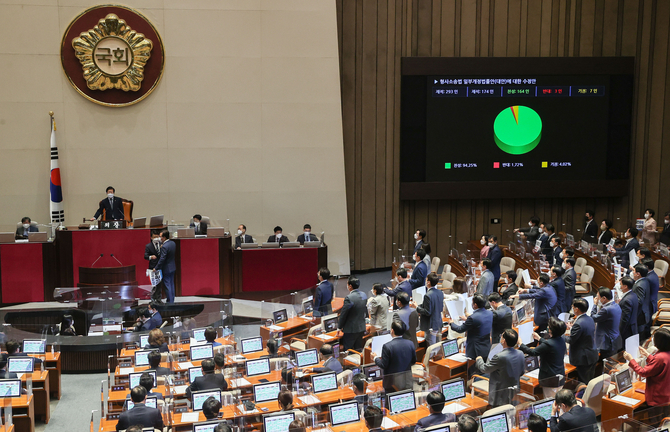 그러면서 검수완박 법안 추진의 정당성을 강조했다. 문 대통령은 “(그간의) 노력과 성과에도 불구하고 검찰수사의 정치적 중립성과 공정성, 선택적 정의에 대한 우려가 여전히 해소되지 않았고 국민의 신뢰를 얻기에 충분하지 않다는 평가가 있었다. 국회가 수사와 기소의 분리에 한 걸음 더 나아간 이유라고 생각한다”고 말했다.