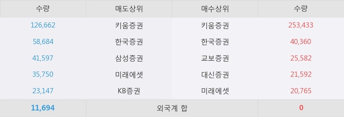 이 시각 주요 거래원은 미래에셋, 키움증권, 한국증권 등이 매수 상위 창구에 자리하고 있다.