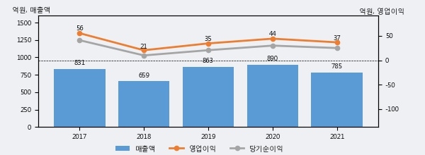 와이어블의 2021년 매출액은 전년대비 -11.8% 줄어든 785억원이고, 영업이익 역시 전년대비 -16.9% 줄어든 37억원을 기록했다. 이 회사의 매출액 증감률과 영업이익 증감률은 각각 코스닥 하위 14%, 하위 34%에 해당된다.