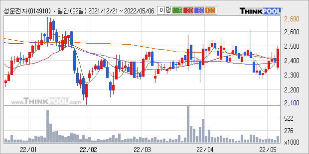 성문전자의 2021년 매출액은 전년대비 30.3% 늘어난 493억원이고, 영업이익은 흑자전환해서 34억원을 기록했다. 이 회사의 매출액 증감률과 영업이익 증감률은 각각 코스피 상위 22%, 상위 6%에 해당된다.
