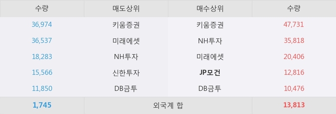거래원 동향은 JP모건, NH투자, 미래에셋 등이 매수 상위 목록에 나타나고 있다.
