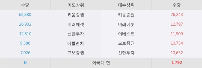 이 시각 주요 거래원은 미래에셋, 키움증권, 이베스트 등이 매수 상위 창구에 자리하고 있다. 한편, 매도 창구 상위에는 메릴린치가 눈에 띄고 있다.