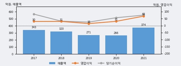 최근 실적을 살펴보면 2021년 매출액이 최근 5년 중 가장 높은 실적을 기록했음을 알 수 있다. 이전 최고 실적이었던 2017년 보다도 9.1%(31억 2천만원) 늘어난 것으로 나타났다.