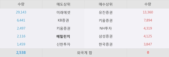거래원 동향은 메릴린치, 미래에셋이 매도 상위 목록에 나타나고 있다.