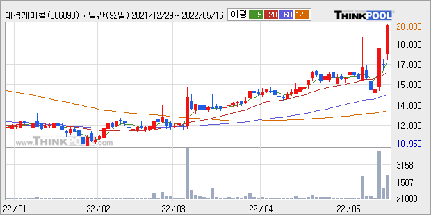 태경케미컬은 2021년 매출액 541억원과 영업이익 121억원을 기록했다. 전년대비 매출은 14.9%, 영업이익은 57.7% 각각 상승했다. 이 회사의 매출액 증감률과 영업이익 증감률은 각각 코스피 상위 46%, 상위 37%에 해당된다.