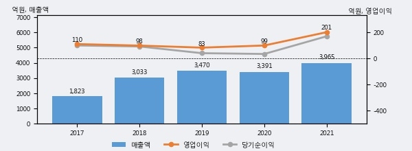 최근 실적을 살펴보면 2021년 매출액이 최근 5년 중 가장 높은 실적을 기록했음을 알 수 있다. 이전 최고 실적이었던 2019년 보다도 14.2%(494억 5천만원) 늘어난 것으로 나타났다.