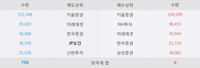 거래원 동향은 NH투자, 미래에셋, 삼성증권 등이 매수 상위 목록에 나타나고 있다. 한편, 매도 창구 상위에는 JP모건이 눈에 띄고 있다.