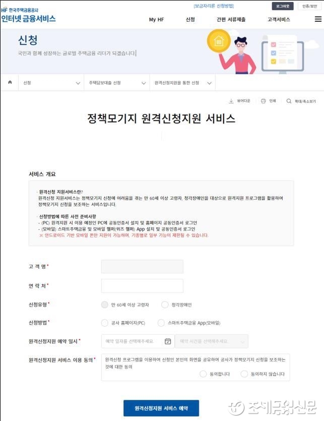 18일 HF공사는 PC나 스마트폰 등을 통해 보금자리론과 디딤돌대출 등 정책모기지 신청에 익숙하지 않은 만 60세 이상 고령자와 청각 장애인을 위한 '원격신청 지원 서비스'를 한다고 밝혔다.