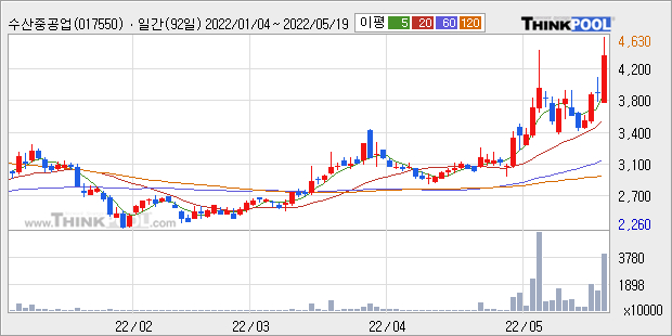 수산중공업의 2021년 매출액은 전년대비 83.6% 늘어난 2530억원이고, 영업이익 또한 전년대비 103.9% 늘어난 143억원을 기록했다. 이 회사의 매출액 증감률과 영업이익 증감률은 각각 코스피 상위 3%, 상위 26%에 해당된다.