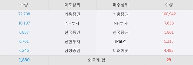 거래원 동향은 JP모건, NH투자, 미래에셋 등이 매수 상위 목록에 나타나고 있다.