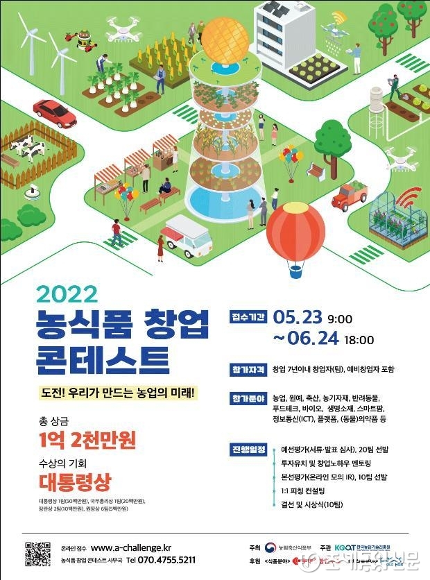 (조세금융신문=송기현 기자) 농림축산식품부는 오늘부터 내달 24일까지 '2022년 농식품 창업콘테스트' 참가자를 모집한다.