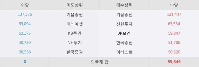 JP모건이 매수상위 창구 3위를 기록중이고, 그 외에 키움증권, 신한투자 등이 매수 창구 상위에 위치하고 있다.