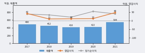 최근 실적을 살펴보면 2021년 매출액이 최근 5년 중 가장 높은 실적을 기록했음을 알 수 있다. 이전 최고 실적이었던 2017년 보다도 11.1%(54억 5천만원) 늘어난 것으로 나타났다.