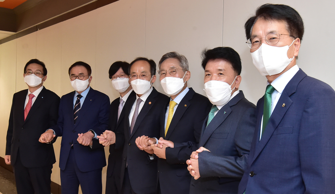 한편 이날 간담회에는 추 부총리와 김 부위원장을 비롯해 조용병 신한금융지주 회장, 윤종규 KB금융지주 회장, 함영주 하나금융지주 회장, 손태승 우리금융그룹 회장, 손병환 NH농협금융지주 회장 등 5대 금융지주 회장이 참석했다.