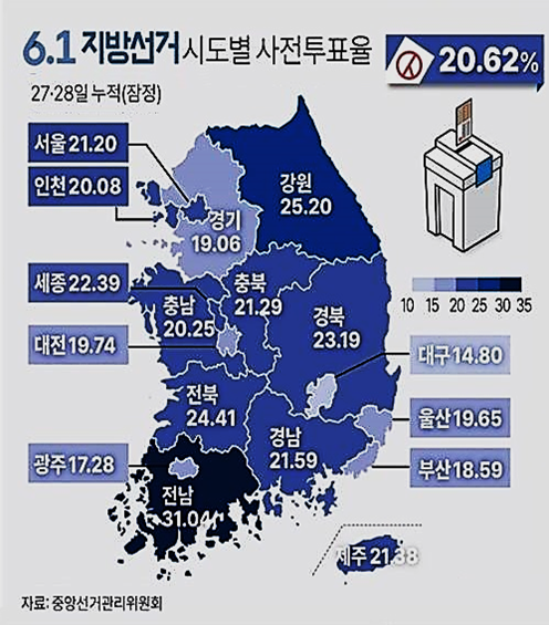 (조세금융신문=박청하 기자) 6·1 지방선거 사전투표율이 최종 20.62%를 기록, 역대 지방선거 사전투표율 가운데 가장 높은 수치이자 모든 전국단위 선거 중에서는 역대 네 번째로 높은 투표율을 나타냈다.