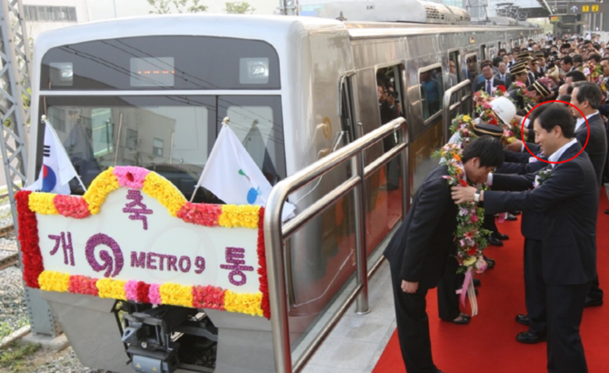 2009년 7월 개화~신논현 구간의 1단계 개통이 됐고, 대통령이 된 MB의 지시로 계약된 민영화 구간 개통식에 당시 재임 중이던 오세훈 시장이 참석한 것이 언론보도와 사진을 통해 명백하게 드러났다는 것이 민주당의 설명이다.