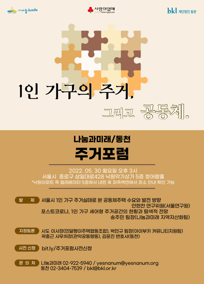 (조세금융신문=고승주 기자) 재단법인 동천(이사장 강용현)과 사단법인 나눔과미래(이사장 송경용)가 30일 오후 3시 낙원악기상가 청어람홀에서 ‘1인 가구 주거복지를 위한 공동체 주택 활성화 방안 모색 포럼’을 개최한다.