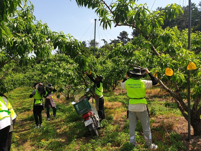 이날 행사에는 여신관리부를 비롯해 강원영업본부와 동춘천농협 임직원이 참여해 복숭아 봉지씌우기, 과수원 주변 환경정비 작업을 진행했다.