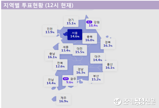 현재까지 투표율이 가장 높은 지역은 강원(18.4%)이고, 제주(16.9%), 경남·경북(16.3%), 충남·울산(16.1%), 충북(16.0%)이 뒤를 이었다.