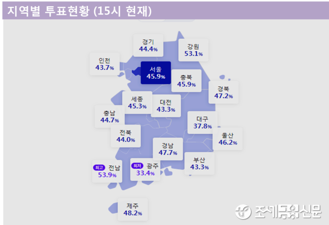 지역별로 보면 전남이 현재 52.3%로 가장 높은 투표율을 보였으며, 강원(51.0%), 경북(46.1%), 제주(46.0%), 경남(45.5%) 등이 뒤를 이었다.