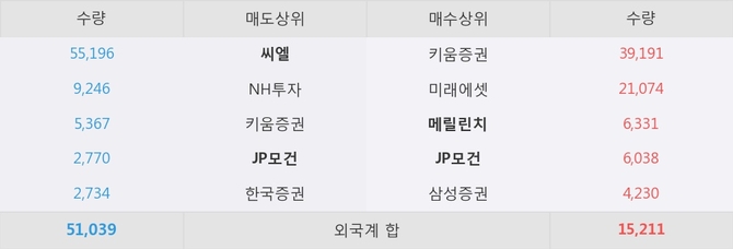 거래원 동향은 메릴린치, JP모건, 미래에셋 등이 매수 상위 목록에 위치하고 있다. 한편, 매도 창구 상위에는 씨엘과 JP모건이 눈에 띄고 있다.