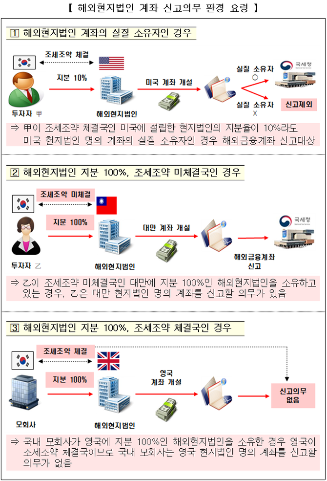 실질적 소유자 계좌를 신고할 때는 현지법인에 대한 지분율이나 현지법인 소재지국이 조세조약 체결국인지 여부를 가리지 않고 해당 현지법인 명의의 계좌를 신고해야 한다.