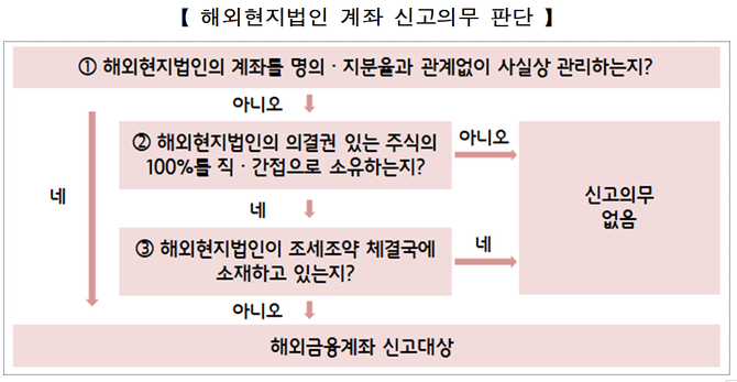 거주자 및 내국법인이 계좌를 사실상 관리하지 않더라도 현지법인의 의결권 있는 주식을 직접・간접적으로 100% 소유한 경우, 해당 현지법인이 조세조약 미체결국에 소재하는 경우에도 신고해야 한다.