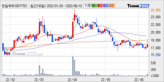 한일화학은 2021년 매출액 1139억원과 영업이익 5억원을 기록했다. 전년대비 매출은 31.3% 상승했고, 영업이익은 -65.8% 하락했다. 이 회사의 매출액 증감률과 영업이익 증감률은 각각 코스닥 상위 25%, 하위 19%에 해당된다.