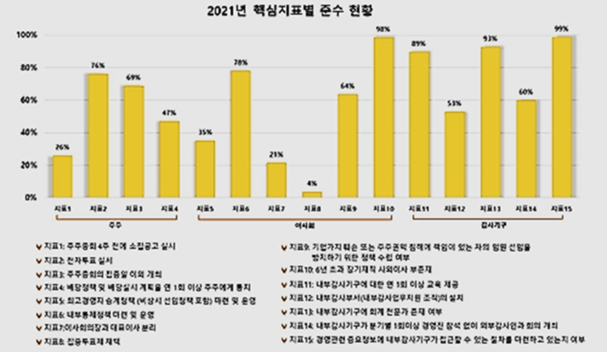아울러 이사회 의장과 대표이사 분리(21%), 주주총회 4주 전 소집 공고(26%), 최고경영자 승계 정책 마련(35%), 연 1회 이상 배당정책 및 배당 계획 통지(47%) 항목 등의 준수율이 50% 미만으로 나타났다.