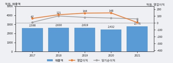 최근 실적을 살펴보면 2021년 매출액이 최근 5년 중 가장 높은 실적을 기록했음을 알 수 있다. 이전 최고 실적이었던 2018년 보다도 5.5%(145억 5천만원) 늘어난 것으로 나타났다.