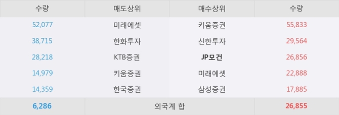 이 시각 주요 거래원은 미래에셋, 한화투자, KTB증권 등이 매도 상위 창구에 자리하고 있다. 한편, 매수 창구 상위에는 JP모건이 눈에 띄고 있다.