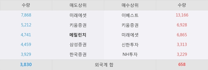 거래원 동향은 미래에셋, NH투자 등이 매수 상위 목록에 나타나고 있다. 한편, 매도 창구 상위에는 메릴린치가 눈에 띄고 있다.