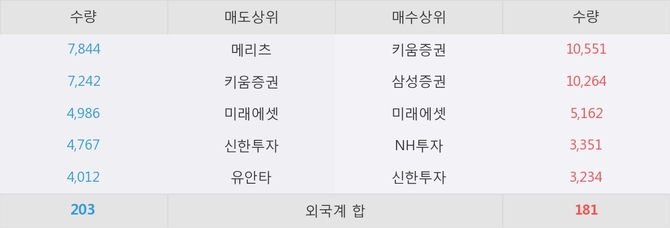 거래원 동향은 메리츠, 미래에셋 등이 매도 상위 목록에 나타나고 있다.