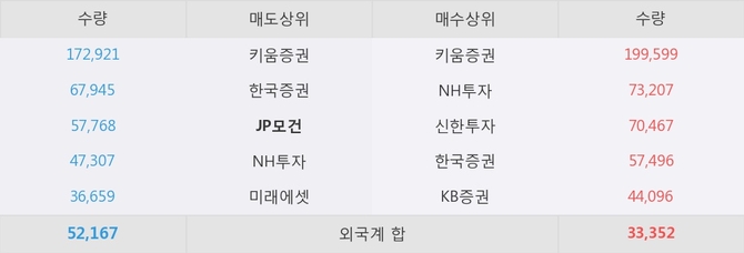 이 시각 주요 거래원은 NH투자, 키움증권, 신한투자 등이 매수 상위 창구에 자리하고 있다. 한편, 매도 창구 상위에는 JP모건이 눈에 띄고 있다.