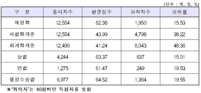 다음으로 어려웠던 과목은 세법학개론(과락률 38.22%)이었으며, 나머지 행정소송법(19.55%), 민법(19.53%), 재정학(15.53%), 상법(15.01%)는 평균점수가 모두 60점대를 넘기며 대체로 무난한 수준으로 나타났다.