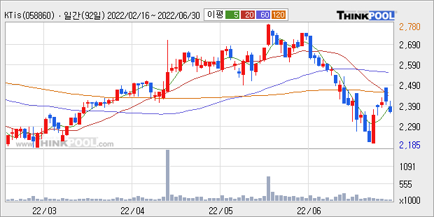 KTis은 2021년 매출액 4680억원과 영업이익 144억원을 기록했다. 전년대비 매출은 3.2%, 영업이익은 60.1% 각각 상승했다. 이 회사의 매출액 증감률과 영업이익 증감률은 각각 코스피 하위 25%, 상위 36%에 해당된다.