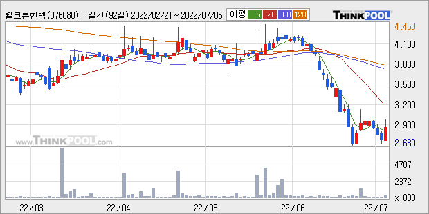 웰크론한텍의 2021년 매출액은 전년대비 33.8% 늘어난 2692억원이고, 영업이익은 적자전환해서 -2억원을 기록했다. 이 회사의 매출액 증감률과 영업이익 증감률은 각각 코스닥 상위 23%, 하위 15%에 해당된다.