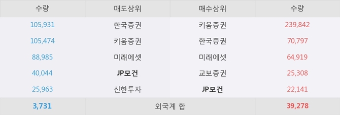 거래원 동향은 JP모건, 미래에셋이 매수 상위 목록에 나타나고 있다. 한편, 매도 창구 상위에는 JP모건이 눈에 띄고 있다.