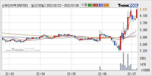 일봉 차트의 모습은 현재 단기·중기 이평선이 정배열 상태로 전형적인 상승세를 보이고 있다. 이 종목의 차트에서 최근에 최근 5일 매물대 돌파, 최근 60일 매물대 돌파, 주가 5MA 상향돌파 등을 확인할 수 있다