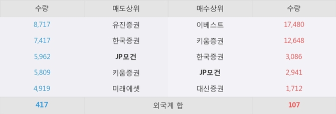 JP모건이 매수상위 창구 4위를 기록중이고, 그 외에 이베스트, 키움증권 등이 매수 창구 상위에 위치하고 있다. 한편, 매도 창구 상위에는 JP모건이 눈에 띄고 있다.