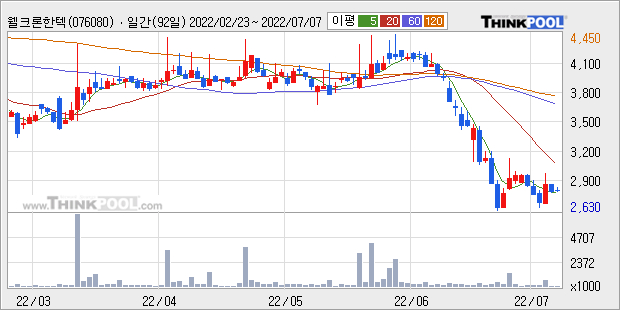 웰크론한텍의 2021년 매출액은 전년대비 33.8% 늘어난 2692억원이고, 영업이익은 적자전환해서 -2억원을 기록했다. 이 회사의 매출액 증감률과 영업이익 증감률은 각각 코스닥 상위 23%, 하위 15%에 해당된다.