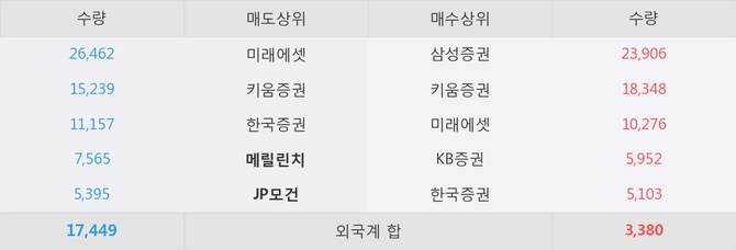 거래원 동향은 메릴린치, JP모건, 미래에셋 등이 매도 상위 목록에 위치하고 있다.