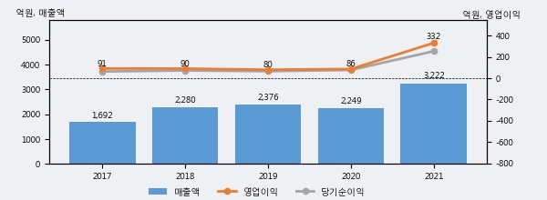 최근 실적을 살펴보면 2021년 매출액이 최근 5년 중 가장 높은 실적을 기록했음을 알 수 있다. 이전 최고 실적이었던 2019년 보다도 35.6%(845억 5천만원) 늘어난 것으로 나타났다.