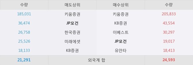 JP모건이 매수상위 창구 4위를 기록중이고, 그 외에 키움증권, KB증권 등이 매수 창구 상위에 위치하고 있다. 한편, 매도 창구 상위에는 JP모건이 눈에 띄고 있다.