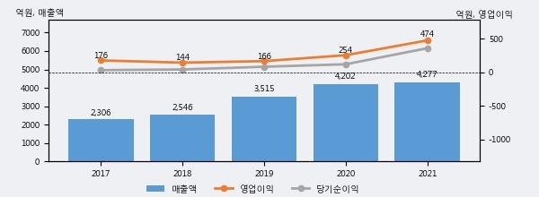 최근 3년간의 실적을 살펴보면 안정적 성장세를 보이고 있다. 최근 3년간 매출로 볼 때 매년 꾸준히 증가하고 있다. 다만 최근에 그 증가폭이 다소 감소하고 있다.
