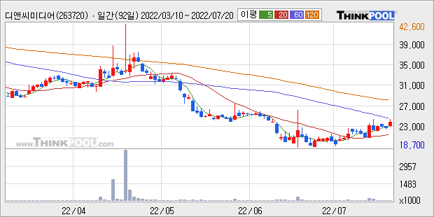 디앤씨미디어의 2021년 매출액은 전년대비 16.8% 늘어난 674억원이고, 영업이익 또한 전년대비 15.2% 늘어난 152억원을 기록했다. 이 회사의 매출액 증감률과 영업이익 증감률은 각각 코스닥 상위 44%, 하위 49%에 해당된다.