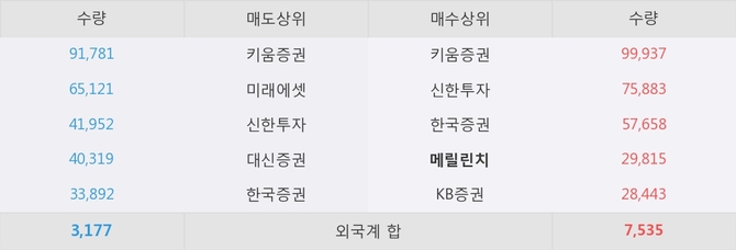메릴린치가 매수상위 창구 4위를 기록중이고, 그 외에 키움증권, 신한투자 등이 매수 창구 상위에 위치하고 있다.