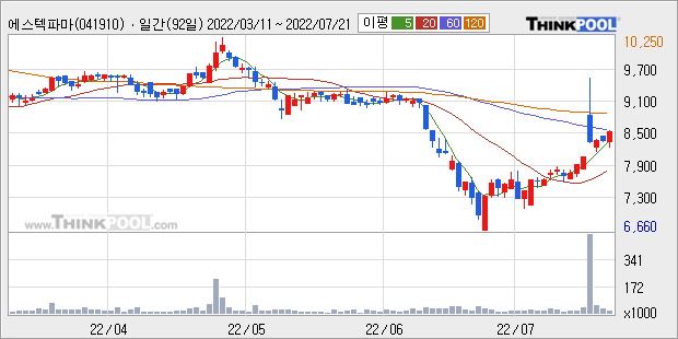 에스텍파마의 2021년 매출액은 604억으로 전년대비 -1.5% 하락했고, 영업이익 역시 42억으로 전년대비 -47.5% 하락했다. 이 회사의 매출액 증감률과 영업이익 증감률은 각각 코스닥 하위 26%, 하위 24%에 해당된다.